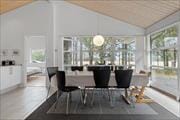 The summer house is beau­ti­ful­ly decorated in a tasteful style, with high ceilings and large window sections that create a bright and friendly at­mosp­he­re. The kitchen is equipped with all possible tools and is open to the dining area, making it easy to serve meals and clean up afterward. In the living room, there are several cozy corners with sofas and armchairs, along with a lovely view of the garden. The three bedrooms all have double beds and wardrobe space, while the two bathrooms both feature showers and un­der­floor heating. One bathroom also includes a hot tub with space for two people. The summer house is well-suited for families with small children, as there is both a crib and a high chair available.