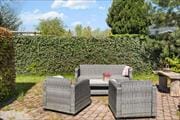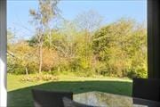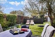 The house nestles at the end of small road with beautiful garden .