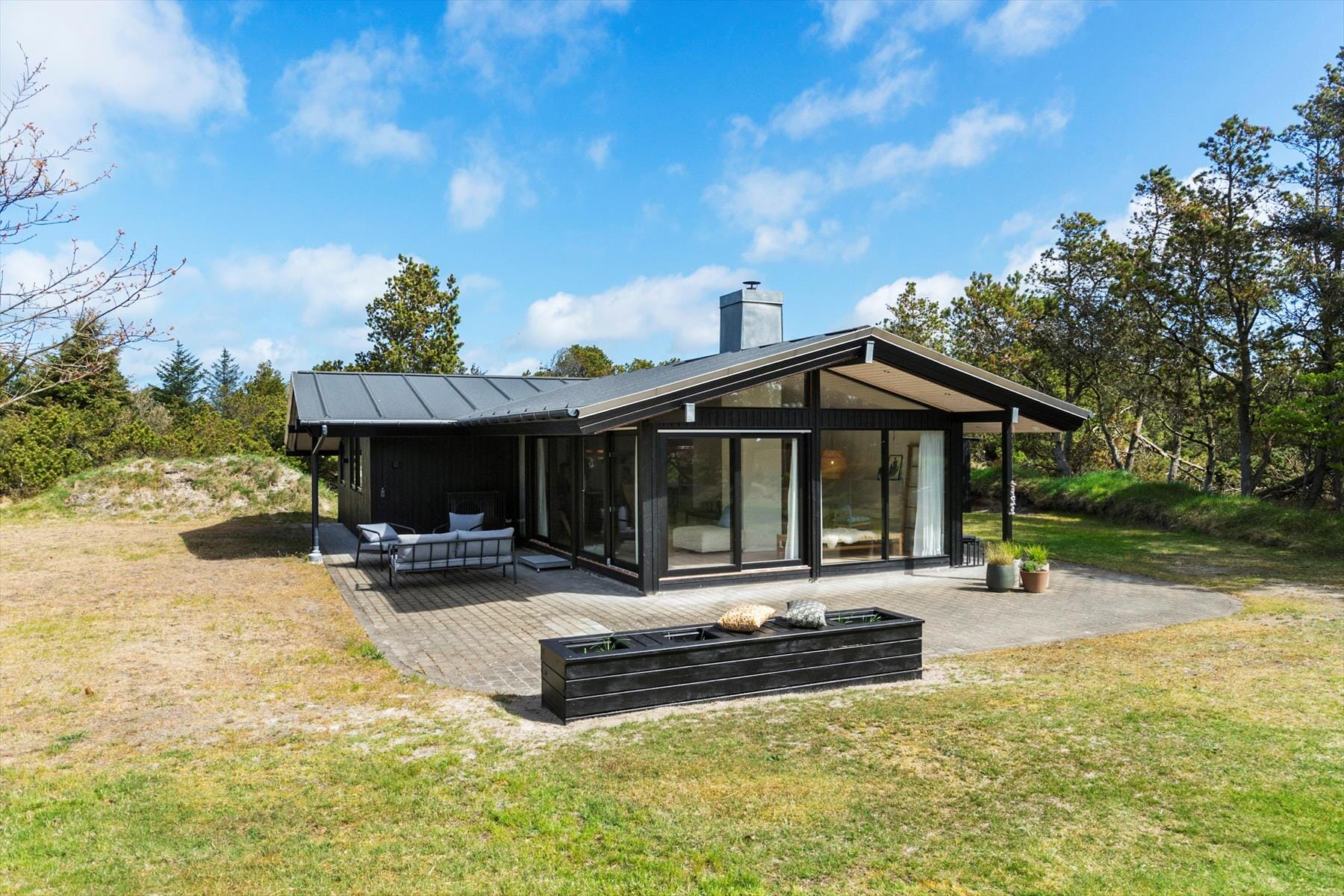 Outdoors, on the 2,406 m² plot, you can also look forward to a wonderful and relaxing holiday life. The holiday home is set well back on the plot, and around it spreads a 100 m² terrace area. To the south, the terrace is paved and partially covered, and behind the house you will find a beautiful and completely secluded wooden terrace arranged on several levels. This is the perfect place to relax, grill, and soak up the sun, and if you need to refresh yourself, you can enjoy an invigorating shower under the outdoor shower.