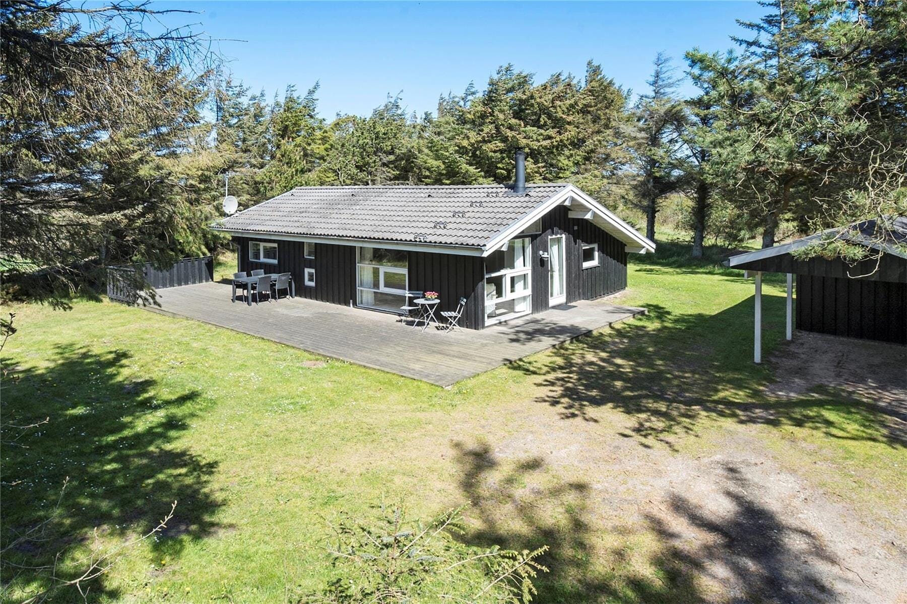 The large outdoor area provides plenty of space for games and activities. The several lovely terraces are perfect for sunbathing or enjoying meals outdoors. You can sit comfortably on one of the terraces and enjoy the sun or find a shady spot to take a break. The secluded plot offers both privacy and opportunities for fun in nature. In the evening, you can fire up the grill and enjoy a meal under the open sky while taking in the beautiful surroundings.