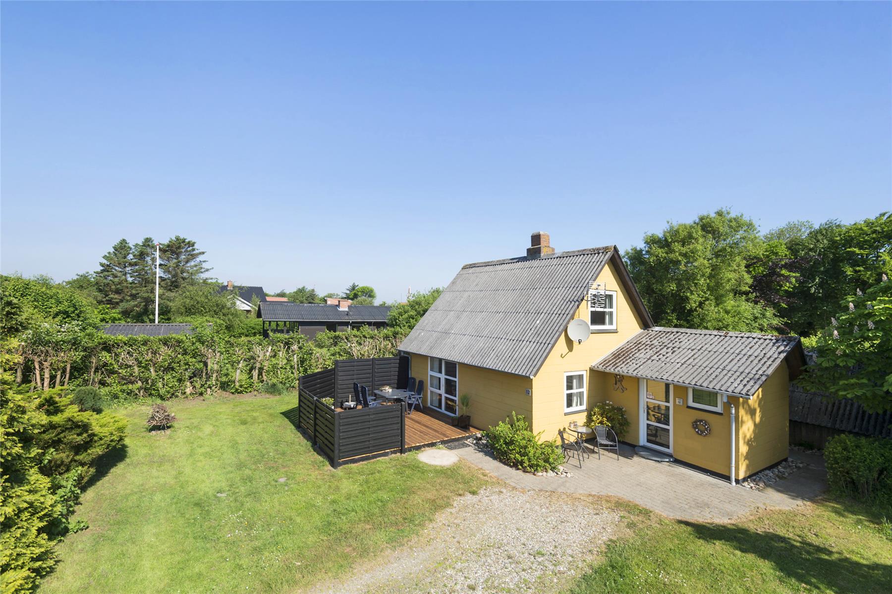 The garden's south-facing wooden terrace is shielded by fences on several sides, so it is a wonderful oasis on a sunny day or a summer evening. If you need shade, you can find the parasol, so you can eat dinner outside, and when the meal is finished, there is plenty of space to play and on the large lawn.