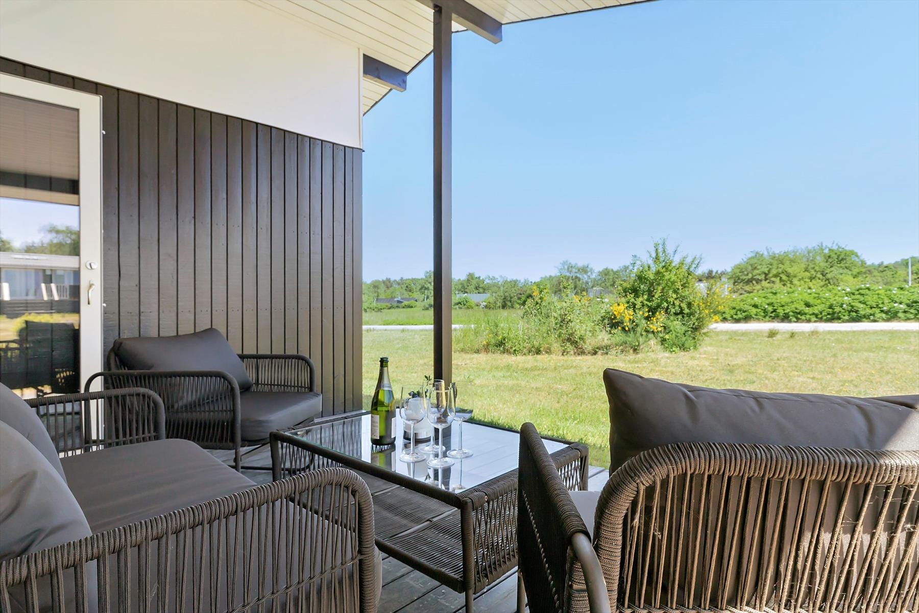 Just 350 meters from the house’s door, you’ll find the lovely, child-friendly beach. The flat, spacious ground around the house is perfect for activities, ball games, and outdoor play. There are two sunny terraces – one to the east by the entrance and one to the west with an exit from the living room. On the east-facing terrace, you can enjoy the morning sun with a cup of coffee, while on the west-facing terrace, you can relax on the lounge furniture and enjoy the long summer evening with a grill and some cozy chats.
