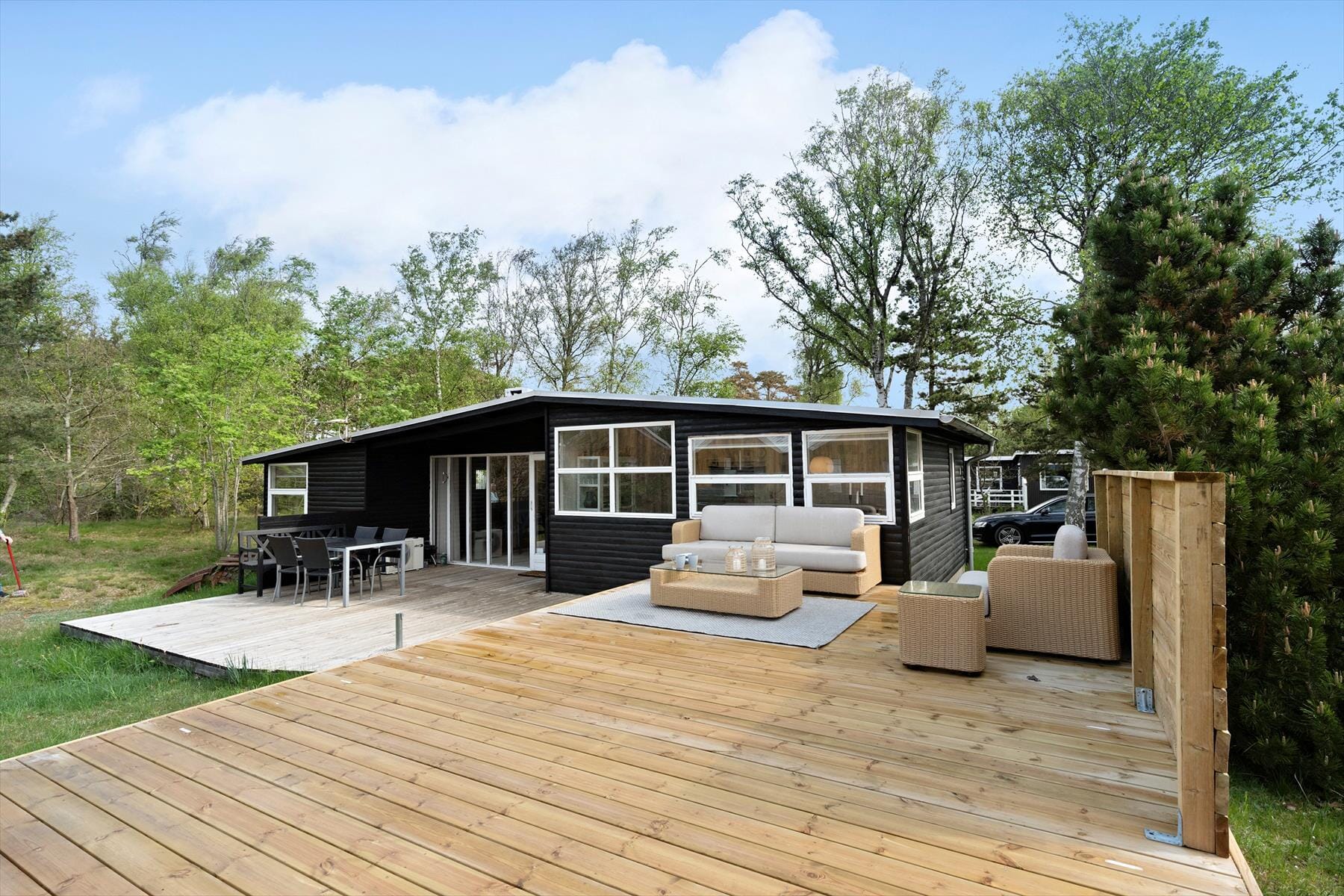 The house is located on a large natural plot with a wooden terrace and fantastic sea views. Ideal for play and outdoor activities. The house has lovely wooden terraces with garden furniture, sun loungers and barbecue. If you're up early, you can experience nature's own animals grazing. You can also hear the sea from the terrace, so sit back and enjoy it all to the fullest. You can also take a morning swim in 2 minutes and be down by the water for a refreshing bath. The sun is on the water side of the house all day, when it's out that is. On other days, the area is suitable for long walks.