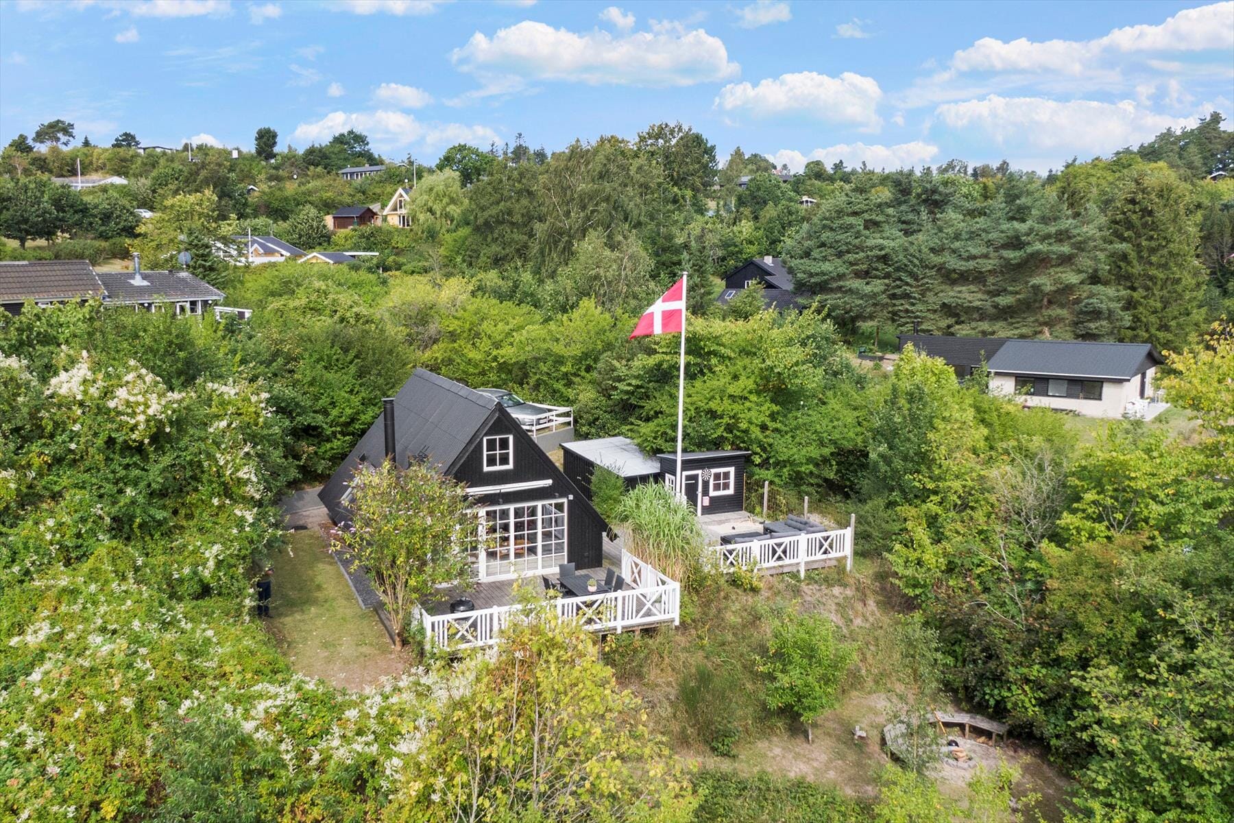 The holiday home is located at the end of a closed road and has a beautiful view of the hilly landscape. The elevated location gives you a wonderful sense of tranquillity and you are only 600 metres from the child-friendly beach in Ebeltoft Vig. Outside you'll find a fantastic plot with a large terrace where you can enjoy the sun while the children play in the playhouse or sandpit. From the terrace, a staircase leads down to the garden, which is ‘wild with purpose’ - a lovely, enclosed oasis where you can enjoy long afternoons and warm evenings around the fire. There's also a trampoline for the kids and a nail block for the adults who want to compete on their hammering skills.