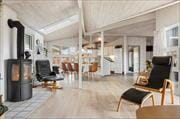 House-ID: 8830Welcome Inside In the deep, dense forest, this summer house hides among the green foliage of the trees. It is a place where every corner exudes coziness and warmth, and where the presence of nature feels like a welcome embrace. On the veranda, there is an atmosphere of relaxation and togetherness, with a terrace heater and a windbreak that create a comfortable cocoon, allowing you to sit outside for a long time. Overhead, the grapevines sway, giving a sense of being on a southern terrace in the middle of the Danish forest. The kitchen has a summer house vibe with a touch of rustic charm. Here, you can prepare delicious holiday meals while keeping an eye on the little ones and chatting with the older ones. In the living room, the flames from the wood-burning stove dance, and in the corner, there is a dining nook with a rustic bench, where you can enjoy meals with a view of the enchanting forest outside. The summer house offers two cozy bedrooms - both with double beds and a sleeping loft, where dreams can fly freely under the sloping ceiling. The bathroom is equipped with everything you need to feel welcome and comfortable.