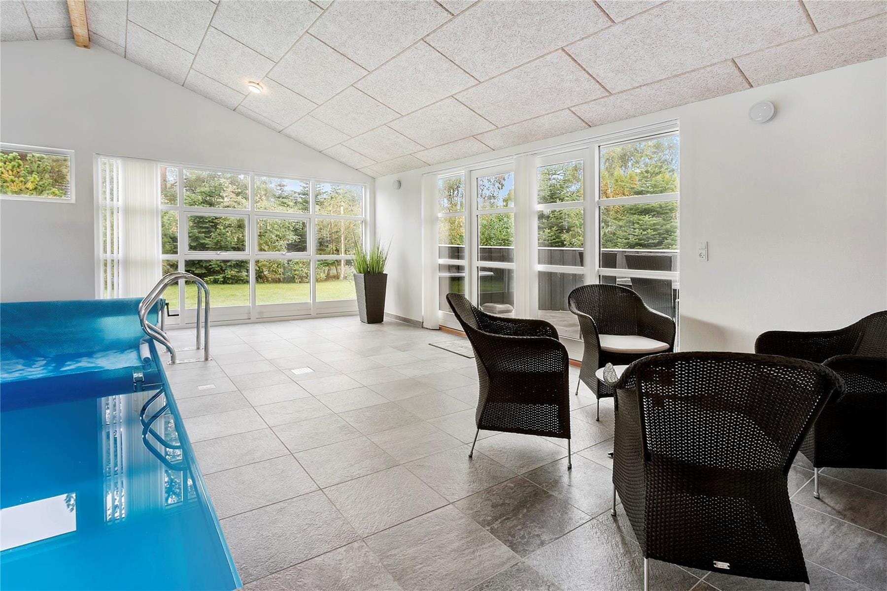At the end of the living room is a small hall leading to the pool area. Here you will find a large and beautiful pool room, which has a beautiful heated pool, a bathroom and a large and beautiful window area overlooking the terrace.