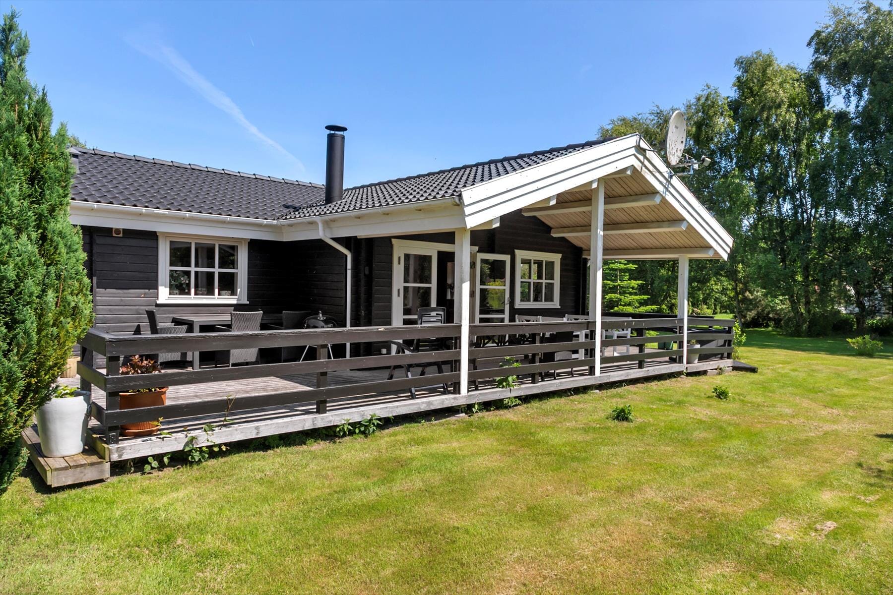 The cottage is located on a 1,163 m2 plot, where there is room for a lot of outdoor activities. The cottage has a beautiful terrace with garden furniture and barbecue, in addition there is a carport in the driveway. In the garden there is a swing set and sandbox for the little ones.