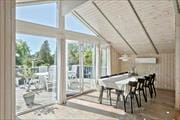 Good and bright decor, with high ceilings throughout the house. Decorated with entrance to a small entrance, with access to a bedroom and the bathroom and the guest toilet. Continue to the kitchen, which contains everything needed for the holiday and which leads one further into the large and well-furnished living room, which appears in bright and inviting condition. From the living room there is access to the house's last three bedrooms, as well as access to the lovely wooden terrace which offers garden furniture and a small cover.