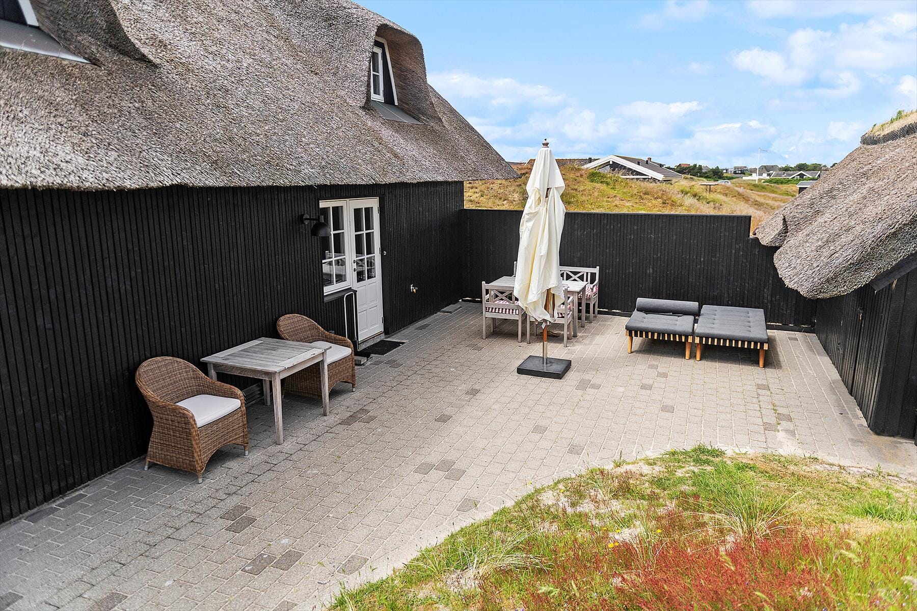 Although it is delightful to relax in the atmospheric and well-furnished house, you will likely feel the urge to move outside as soon as the sun shines. It is wonderful to lean back in a good garden chair in summer temperatures and fresh, salty air. A large, partially sheltered terrace area extends around the house, but you can also sit in the garden furniture directly on the dune top. From the hilly plot, you can enjoy the view of the sea and the undulating landscape, and with the right wind conditions, you might even see colorful kites dancing in the sky above the beach.