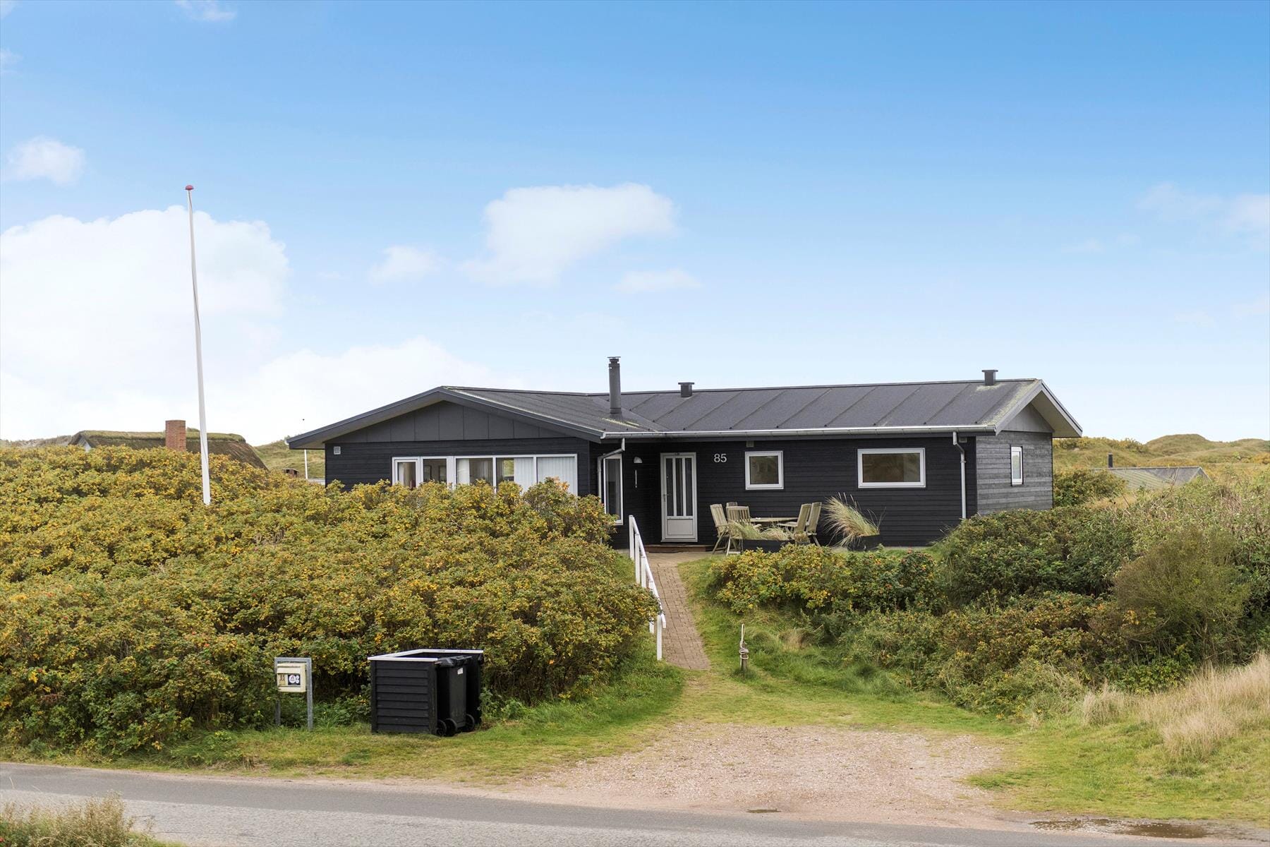 From the parking area on the nature plot, you can follow a path up to the holiday home and the open tiled terrace, which is oriented towards the northeast. It’s lovely to be here, but it’s likely that your favorite spot will become the large and completely secluded wooden terrace facing southwest, which has a beautiful view over the dunes and the stunning evening sky. When the sun is getting ready to set and begins to paint the landscape with its golden warm color palette, it’s wonderful to sit here over a delicious meal or with something nice in your glass, unless you prefer packing a picnic basket and taking your evening coffee down to Rindby Strand.