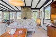 In the living room there is a tiled stove, sofa arrangement and dining area. TV with Danish channels only.