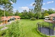 The garden surrounding the summerhouse is a true gem, inviting both play and relaxation. For the kids, the trampoline is a natural gathering point for endless fun and laughter. For the adults, the terrace is the perfect spot to soak up the sun, enjoy a cup of coffee, or gather the family for a barbecue under the open sky. The garden is beautifully landscaped, offering plenty of space for ball games, play, and unwinding. It provides the ideal balance between privacy and scenic natural surroundings.