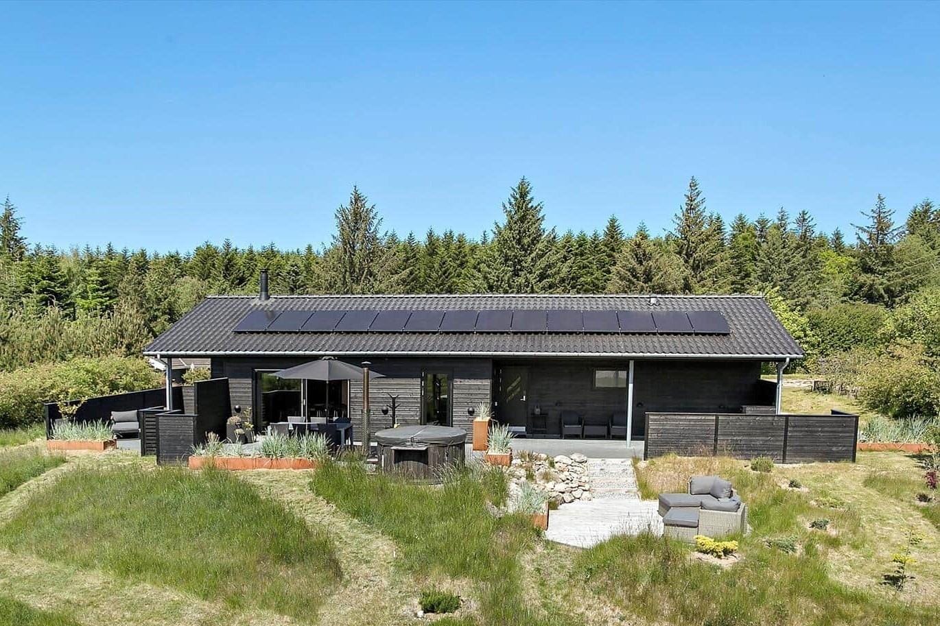 The setting for your holiday is just as wonderful outdoors, where a 1,600 m² natural plot awaits. Whether you prefer the covered or open terrace, you can settle into the garden furniture and enjoy the fresh air – and of course, you can also consider sinking into the outdoor wilderness bath. In almost any weather, it feels like a truly sensory experience to sit in the warm water and let the holiday peace soak in.If you're driving an electric car, it's also good to know that the property is equipped with a charging station.