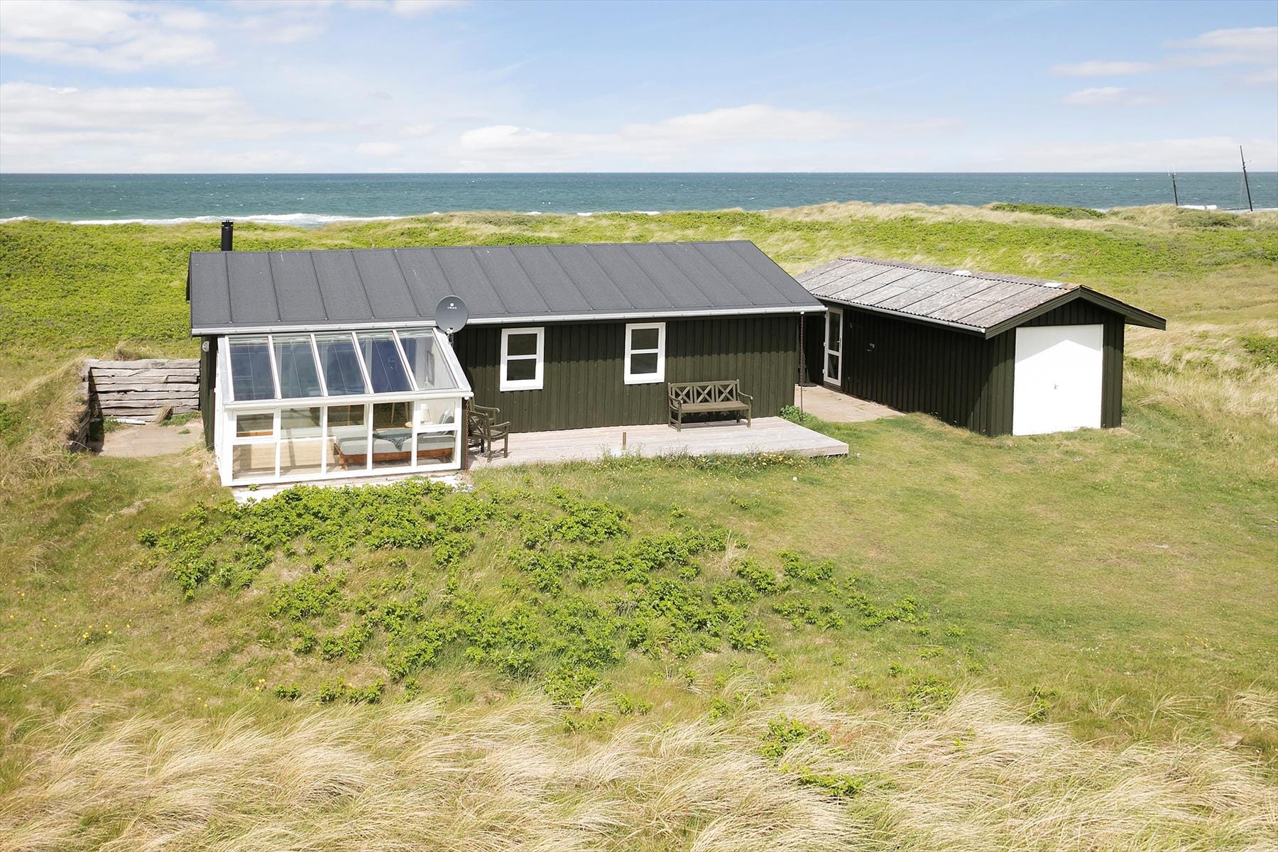 To the southeast of the house, there is a lovely wooden terrace where you can settle into the garden furniture, fire up the grill, and enjoy the peace and quiet – with access directly through the main door. The house is set back on a beachfront plot that is large and slightly undulating. There is ample parking in front of the garage, which is locked and not part of the rental.
