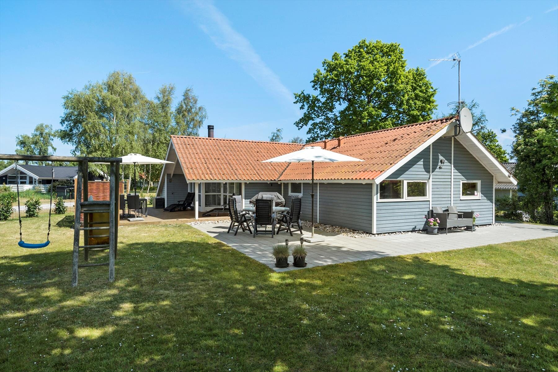 In the garden surrounding the house there are many opportunities to find a cozy corner with or without shade on the house terraces, which are both open and covered. Here you will find several garden furniture, sun loungers and parasols, so there is something for every need and desire.