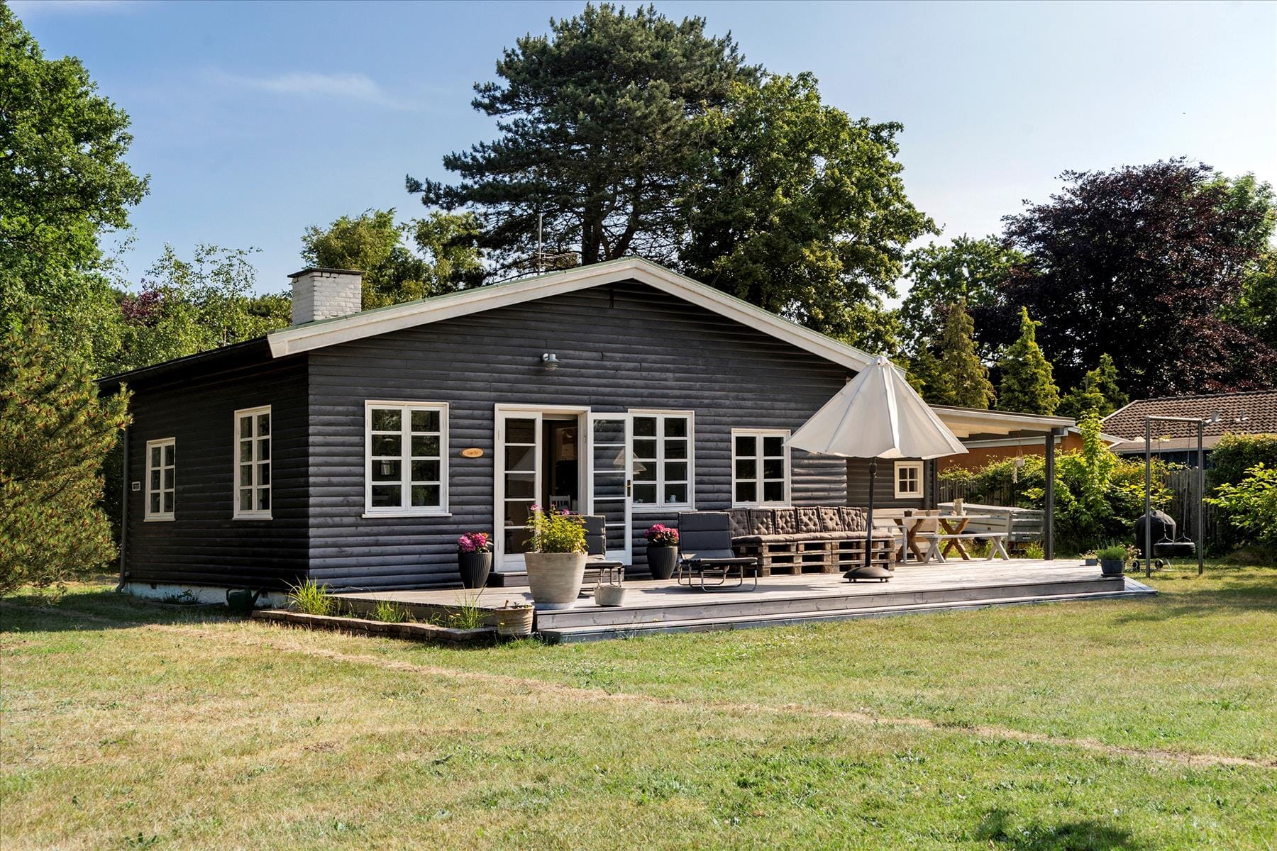 Outside, a spacious green lawn invites you to play games, relax, and enjoy joyful moments. The terrace wrapping around the house allows you to bask in the sun throughout the day – from early morning to late evening. Here, you can grill delicious meals and savor them in the company of family and friends. The outdoor shower is perfect for rinsing off after a day at the beach or simply starting your day refreshed. The long driveway ensures ample parking space and makes arriving and unloading a breeze.