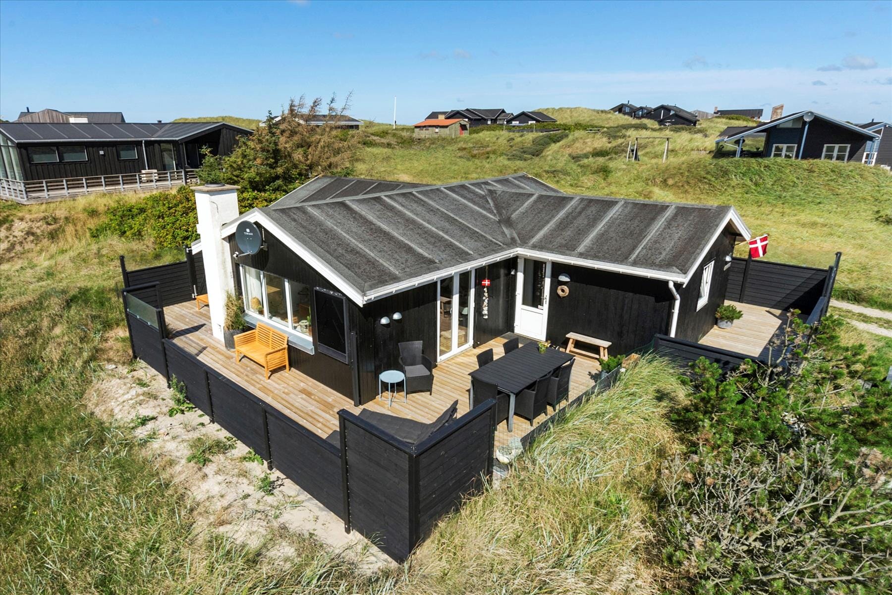 If you feel like a swim or a walk along the North Sea, it’s easily arranged, as it’s just 100 meters down to the beach. Behind the beach-grass-covered dunes lies Grønhøj Strand, a wide beach filled with fine white sand stretching as far as the eye can see. Both on foot and by bike, you can explore the beautiful, hilly local landscape – for example, you can visit the protected Lille Norge nature reserve and climb the Guldagerhøj viewpoint. If you’re in the mood for a café atmosphere or some holiday shopping, Blokhus and Løkken are not far away. If you prefer, you can even drive along the beach, as driving on the beach in both directions is allowed.