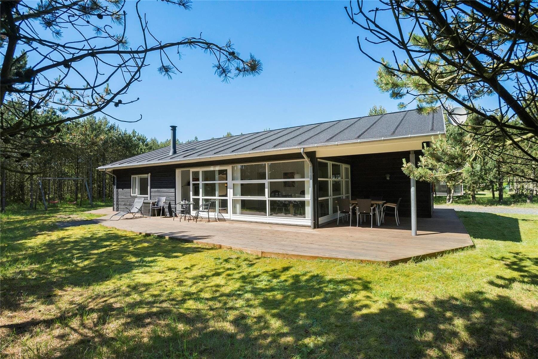 The large natural plot is surrounded by trees, providing privacy from neighbors and passersby. The lawn invites games and hide-and-seek, while the little ones will enjoy the swing. Adults can make the most of summer on the spacious wooden terrace that runs all the way around the house. There is always a sunny spot to find, and if you need to cool off, you can sit on the part of the terrace that is covered. This is also a pleasant spot for dining or relaxing in the evening shade. The car can be parked in the carport, which offers some cool shade.