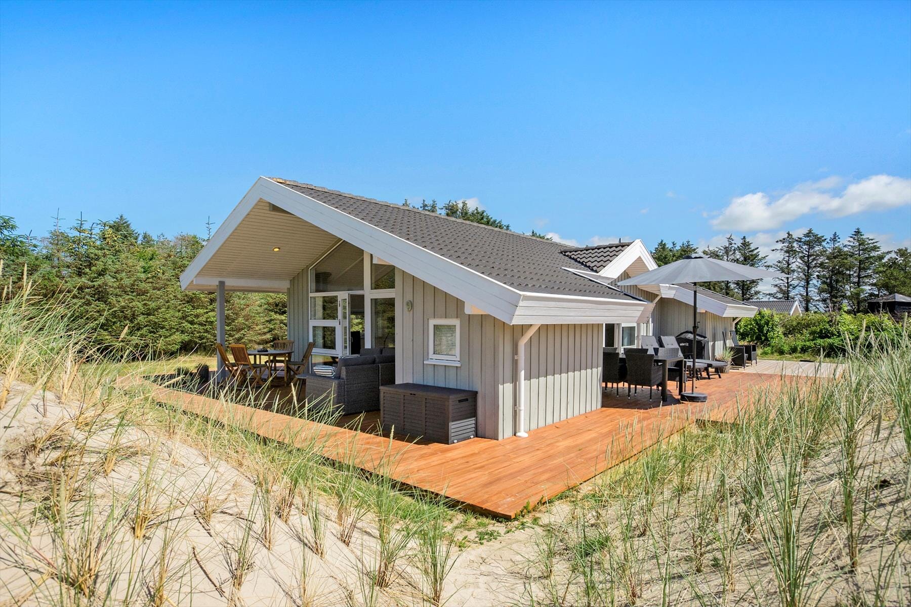Grønhøj is a wonderful place to vacation all year round. The North Sea, just 800 meters from the holiday home, is a stunning sight when the autumn wind whips the waves, and in summer, it’s delightful to spend hours building sandcastles and relaxing on a blanket on the wide sandy beach. If you feel like a little excursion, it only takes a few minutes to drive to Løkken, and if you head south, you’ll quickly reach Blokhus and the popular amusement park Fårup Sommerland.