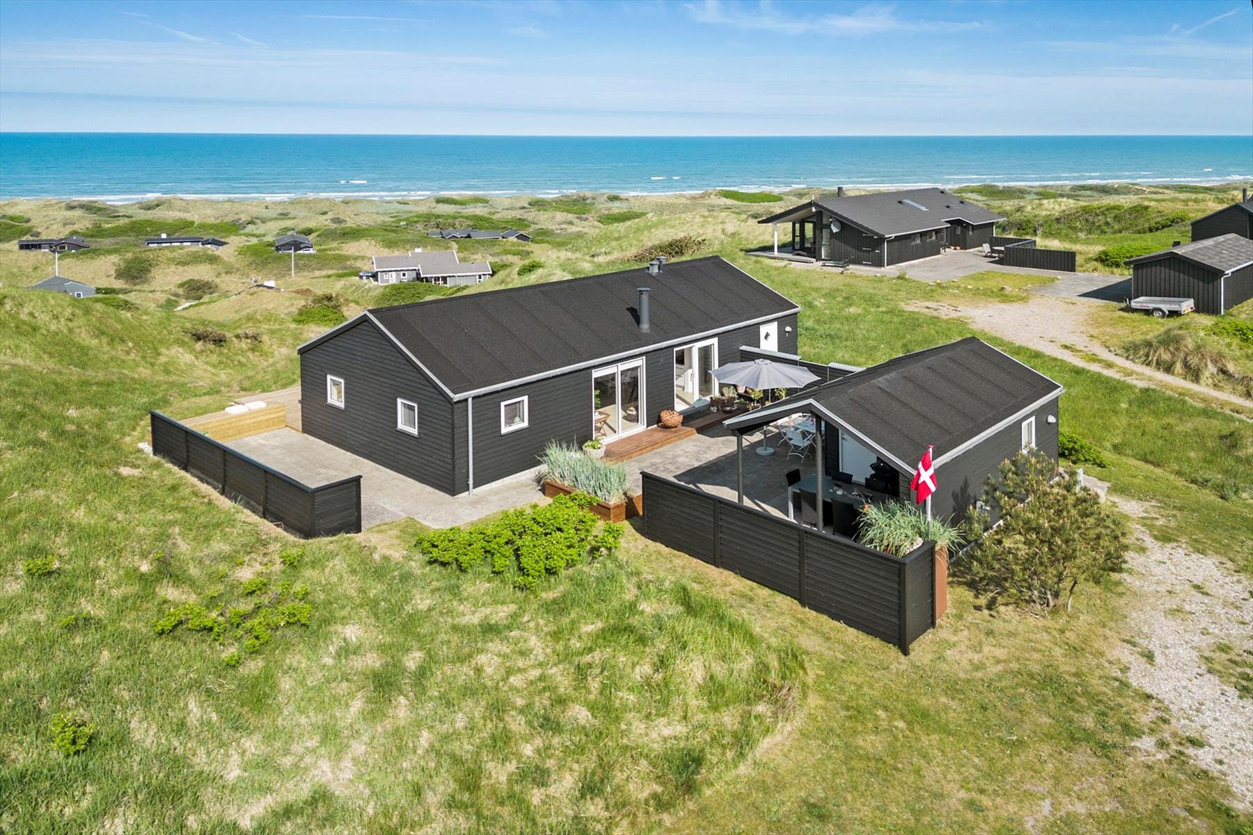 This beautiful holiday home with panoramic views provides the perfect setting for your next holiday in North Jutland. From the entrance, you have access to the house’s beautiful bathroom and the living room. The living room is the heart of the house and includes the open kitchen, dining area, and lounge with a wood-burning stove. The large windows offer a fantastic panoramic view of the sea and dunes, and the entire space gives an ex­cep­tio­nal sense of room due to the vaulted ceiling. From every spot in the living room and the two west-facing bedrooms, you can enjoy the view. The holiday home includes a bathroom with a large shower niche and three bedrooms; one with two single beds, one with a double bed, and the last room contains a single bed and a desk. Here, you can sit by yourself and use the house’s internet if you bring a laptop or tablet.