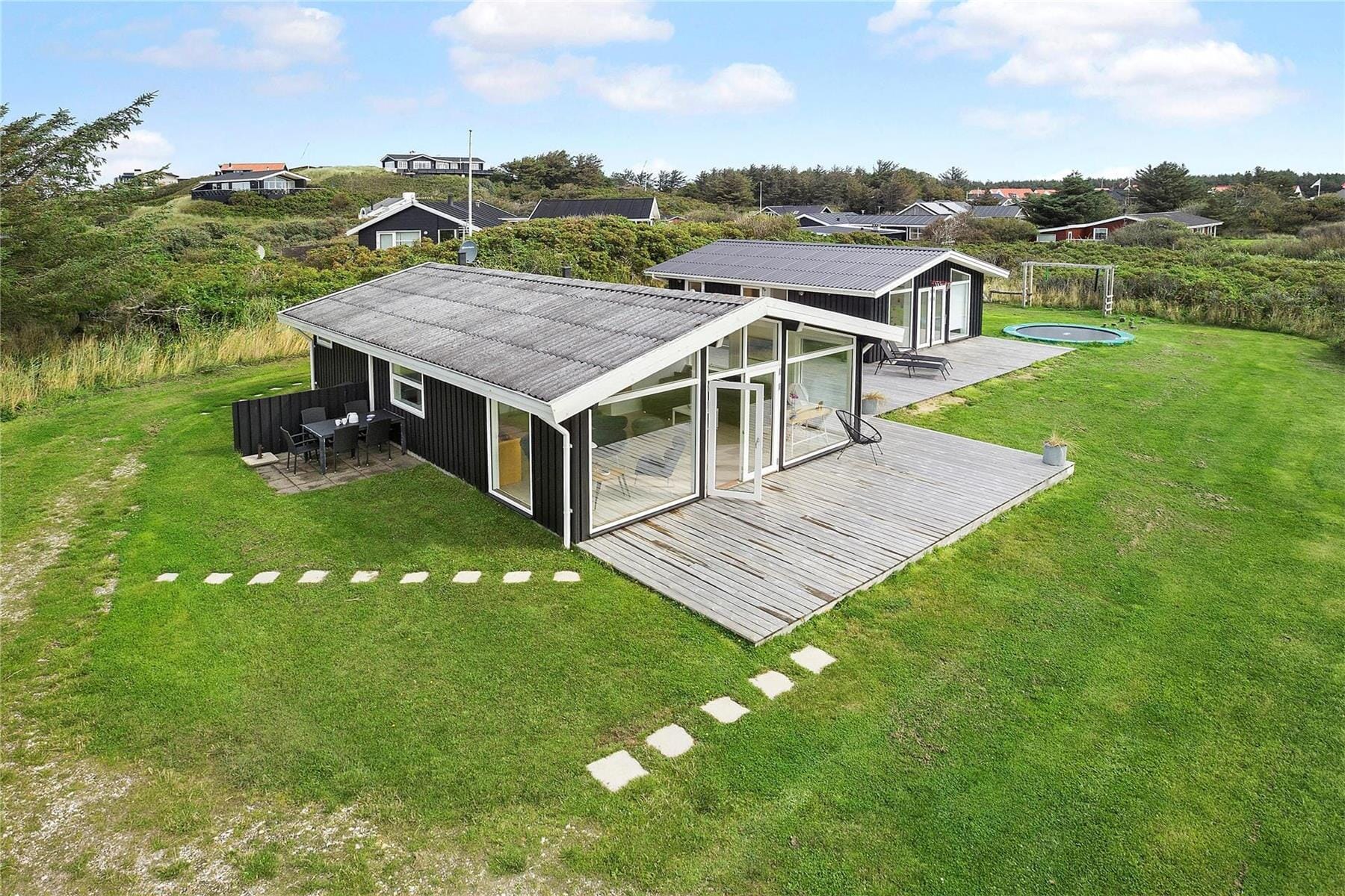 Outside, you also have plenty of opportunities to play and enjoy holiday life, with a trampoline and a football goal on the 2000 m² plot, for example. If you just want to relax in the sun, the large wooden terrace is perfect for that purpose. Depending on the sunlight and your preferences, you can sit on the south-facing terrace area or in the sheltered spot between the summer house and the annexe – there’s even an outdoor sauna here to warm you up after a refreshing dip in the Vesterhavet.