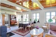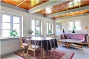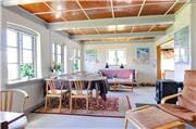 Lovely bright living room with sloping walls, visible rafter, wooden stove and a beautiful view over the Baltic sea.