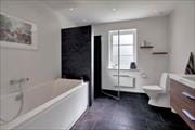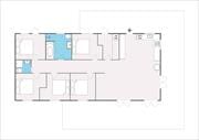 Hallway with washing machine and heat pump plus access to five big bedrooms, all with double beds. Bathroom with shower cabinet and floor heating. Spacious bathroom with shower cabinet, floor heating and bath tub. Living room with access to wooden terrace with awning. Spacious open kitchen with dining section and wood burner as well as access to terrace facing east, south and west. At the north-facing house end you find an outdoor shower.
