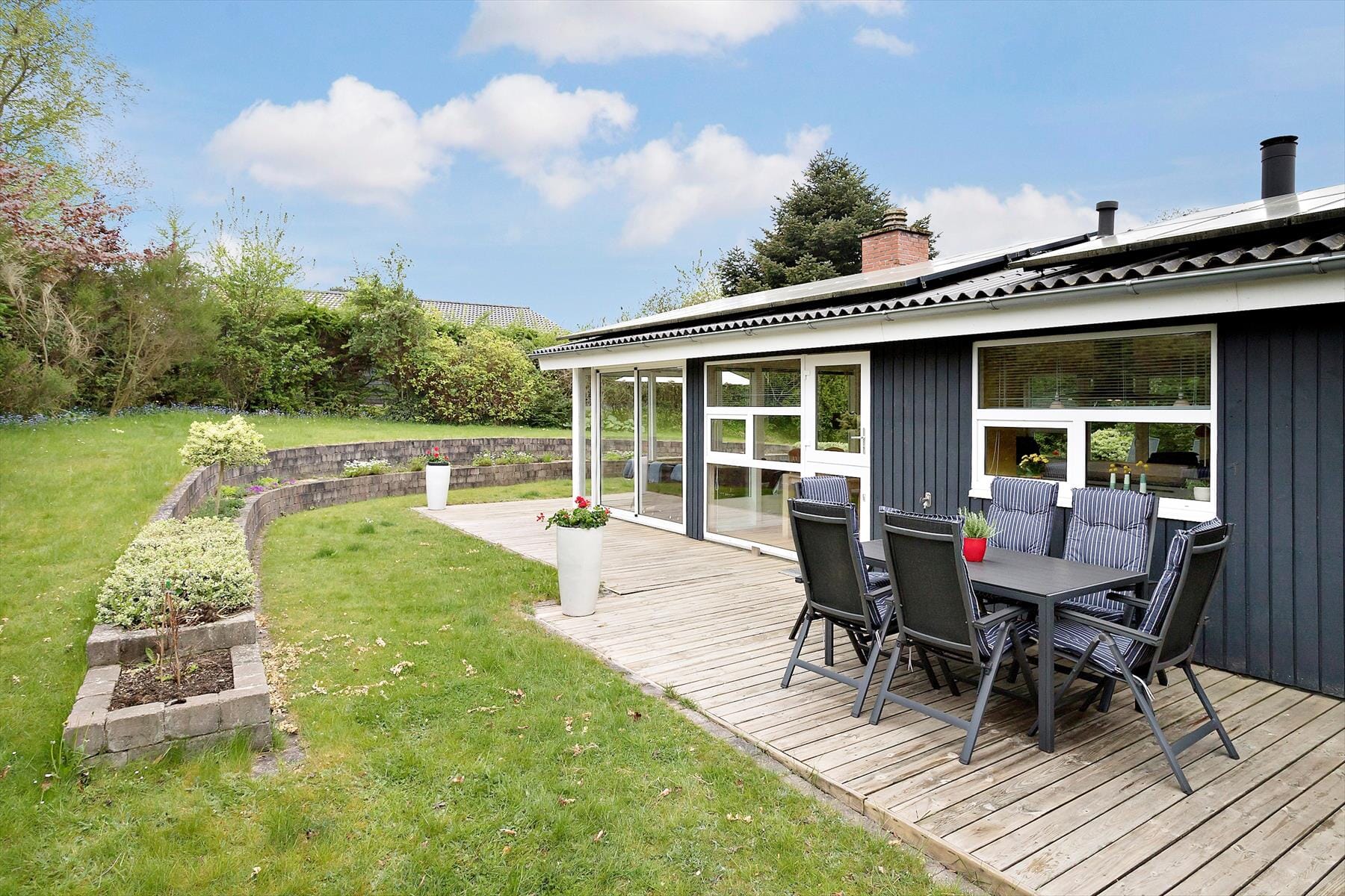 As you step inside, you are greeted by a bright and inviting space where the kitchen and living room blend naturally together. Large windows let the light flow in and create a warm setting for spending time with your loved ones. You can sit down with a good book, enjoy the aroma of fresh coffee or simply relax while gazing out into the garden. The modern facilities and warm materials create an atmosphere where you can unwind and let the holiday feeling take over.