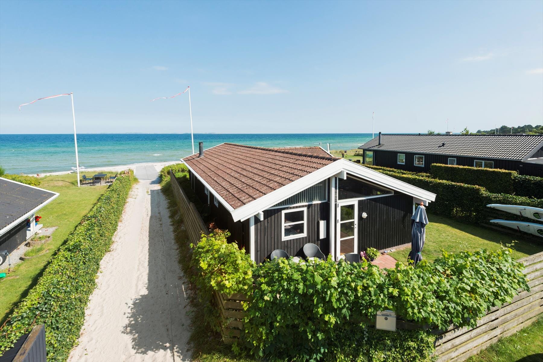 When the sun is shining, the large terrace invites you outside. Here you can enjoy your morning coffee in the comfortable outdoor furniture, grill delicious meals with good local ingredients on the gas grill or relax in the sun on the loungers. The spacious garden is perfect for play and games for both children and adults, and the green surroundings create a peaceful atmosphere. With the beach just on the other side of the hedge, you can walk directly from the garden down to the soft sand. Here you can take a dip in the sea, build sandcastles with the kids, or simply let the waves wash over your feet while enjoying the sound of the ocean's roar. This is where you can truly disconnect and enjoy the simple pleasures of life in the open air.