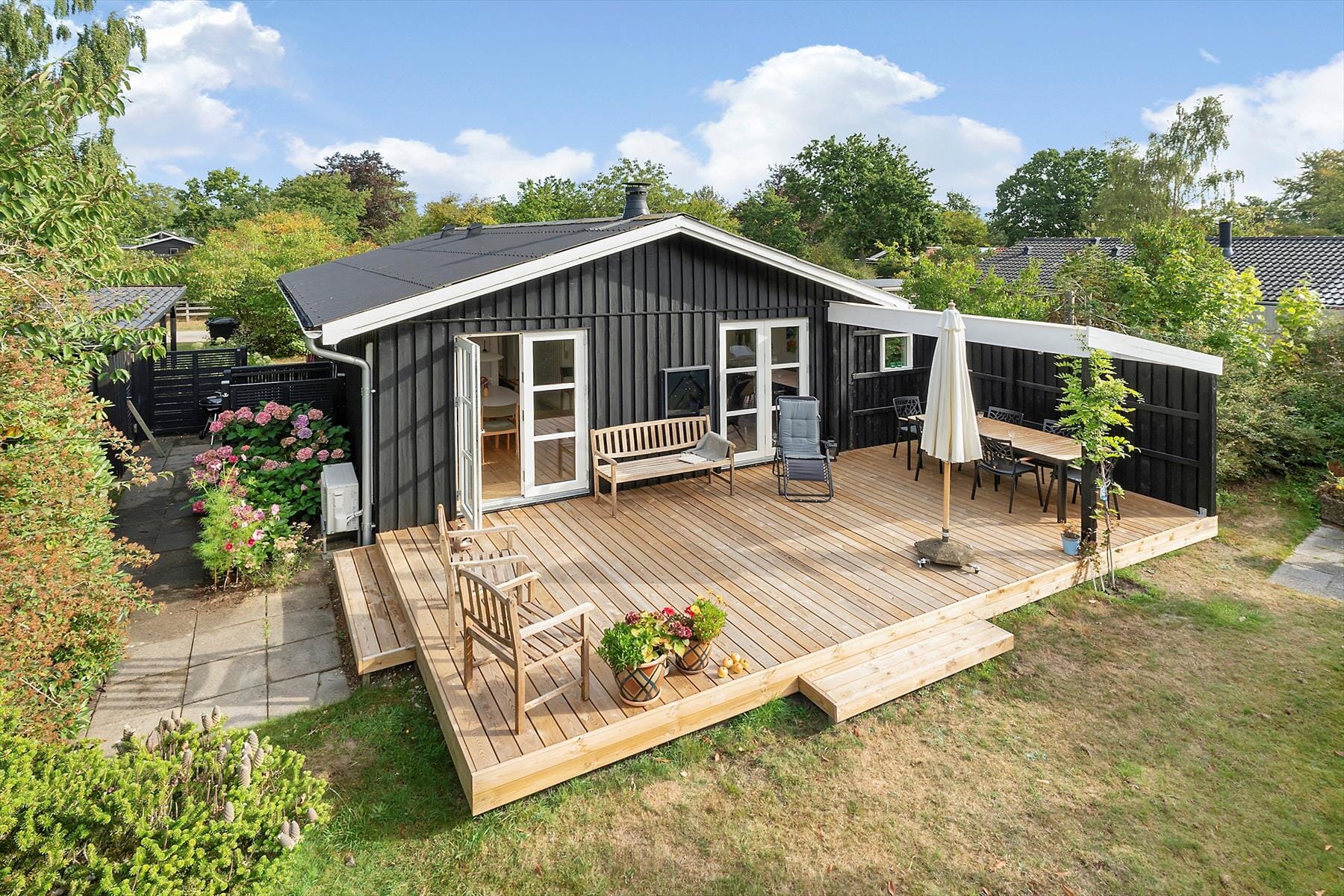 On arrival at this house, there is the option to park in a carport. Brand new wooden terrace facing south with nice garden furniture, sun loungers, barbecue and sun umbrella. For the little ones there is a sandpit and swing. The garden is surrounded by trees and bushes so you can spend the day in complete privacy. With only 400 metres to a beautiful beach, we are sure you will enjoy daily opportunities by the water, whether it is sunbathing, swimming, building sandcastles or taking long walks by the coast.