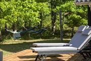 Life outdoors is something truly special here. The enclosed terrace quickly becomes a favorite gathering spot, where you can relax in the soft lounge corner with a cup of coffee or set the table for a delicious dinner while enjoying the view of the green surroundings. Here, you can breathe deeply and let your shoulders drop. Children can play freely in the garden, and if you are up for something different, you can move into the shelters in the backyard and spend the night under the open sky, falling asleep to the sound of the wind in the treetops and birdsong at dawn. It is an adventurous twist to your holiday that both young and old will remember for a long time.
