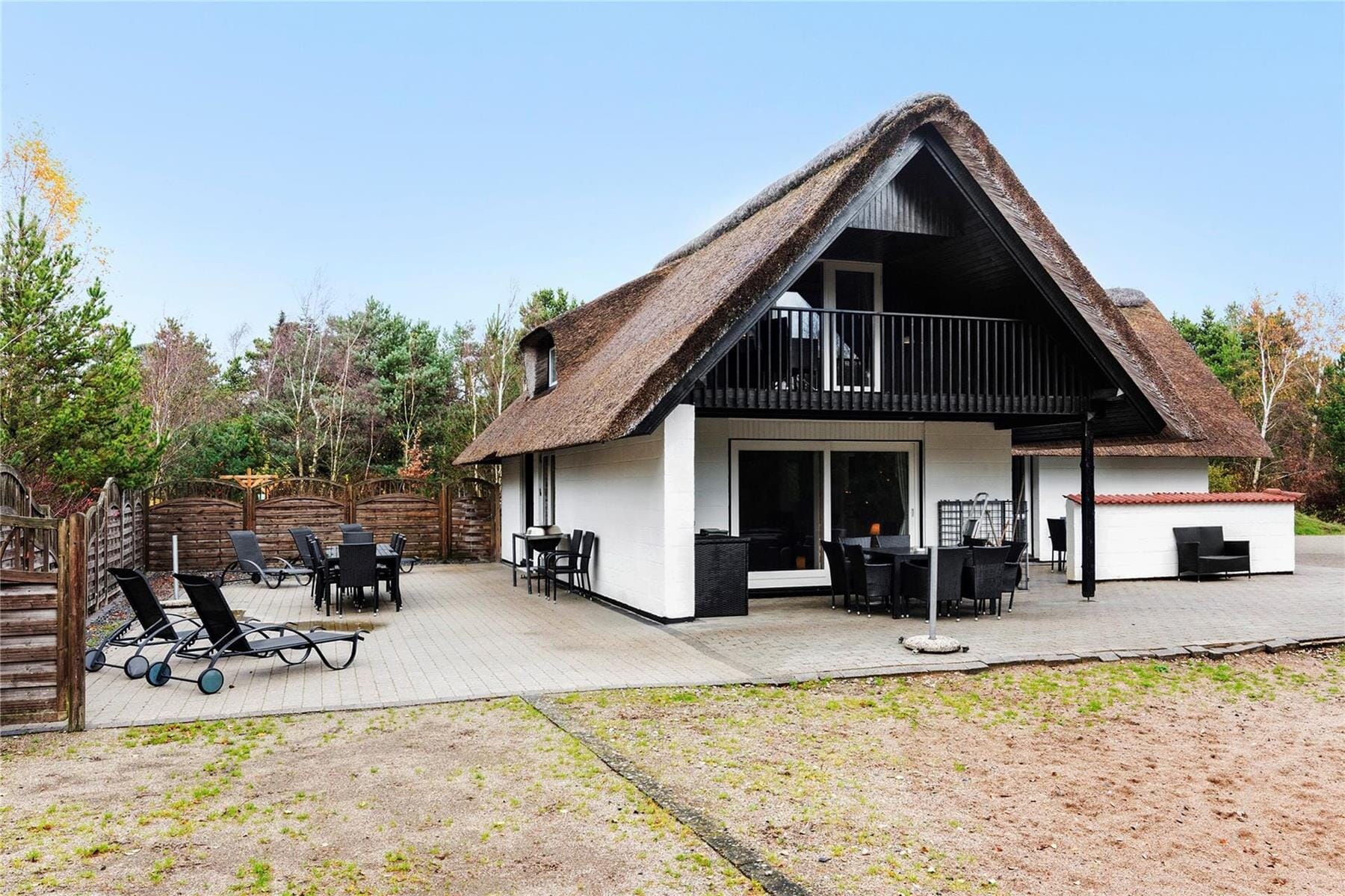 You will have a total of 175 m² to spread out in the thatched summer house, a solid building from 1972. In 2005, the house was renovated, and it now appears neat and well-maintained with many modern conveniences. For example, there is both a spa and a sauna in one of the house's two bathrooms, which is supplemented by a guest toilet on the first floor. The summer house has five bedrooms located on both floors—and this is one of the nice features of the layout, especially when you have many people gathered. It is also great to have two lovely living rooms to gather in: One living room is located on the first floor with direct access to a balcony, while the ground floor features a large living area with a fireplace insert, soft seating, a long table, and an integrated kitchen section.