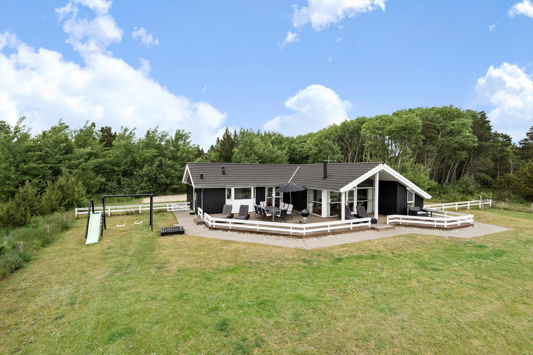 The view is definitely impressive from the large, partially covered wooden terrace that extends to the south of the summer house. It’s a lovely place to relax in the garden furniture, grill, and enjoy the tranquility while appreciating the undisturbed natural surroundings. If you feel like moving around a bit, there’s good space for croquet and other garden games on the lawn, and there is also a swing set and sandbox for the youngest family members.