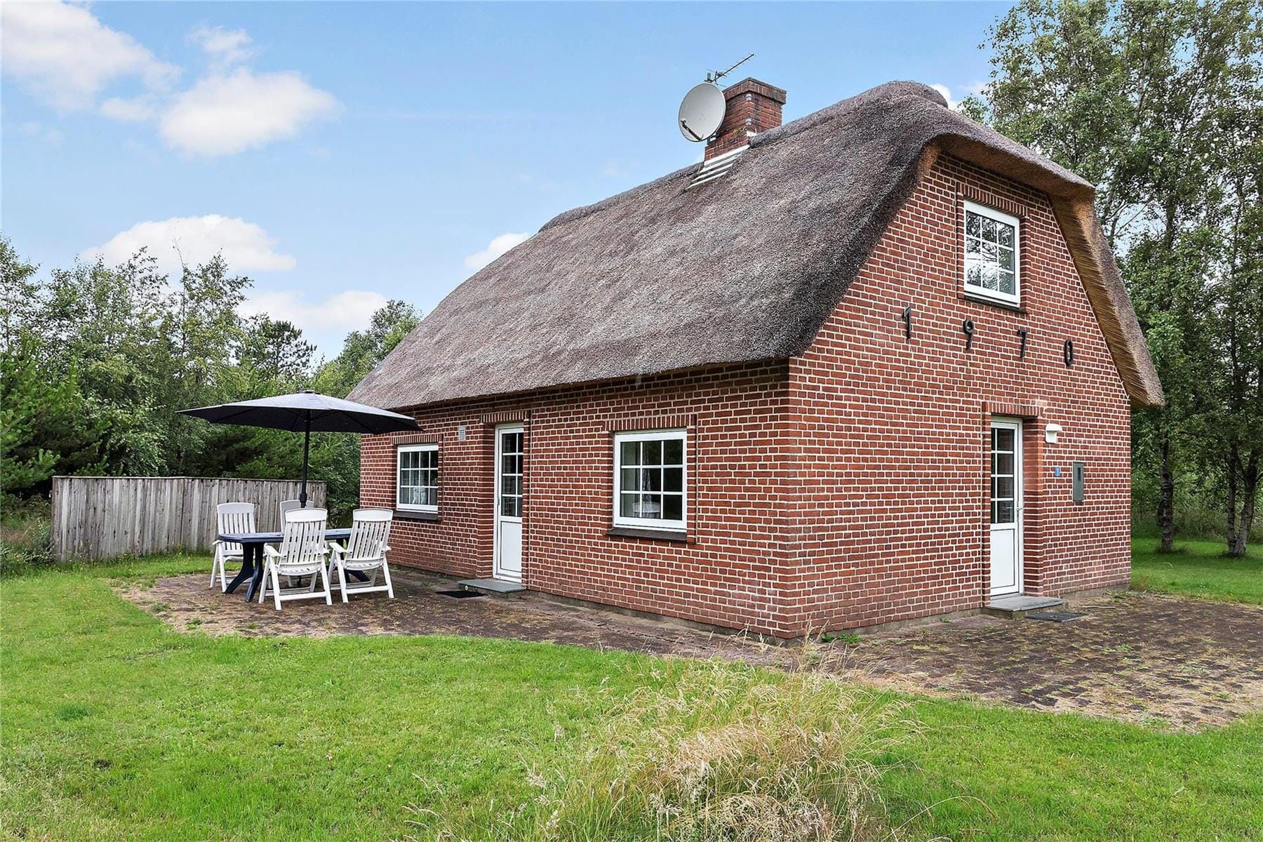 The tranquil and picturesque location is certainly not the only reason to spend your holiday days here, as the summer house is a beautiful building with a thatched roof and sturdy brick facade. Inside, the atmosphere is warm and inviting on both floors, providing a total of 86 m² for you to spread out in. The first floor offers two good bedrooms, while the third bedroom is located on the ground floor by the entrance and bathroom. On the ground floor, you will also find a cozy living area with an open-plan kitchen and living room. The wood-burning stove is one of the charming details, and whether you are cooking in the kitchen or relaxing in the sofa corner, you can enjoy the view of the green garden through the sash windows.