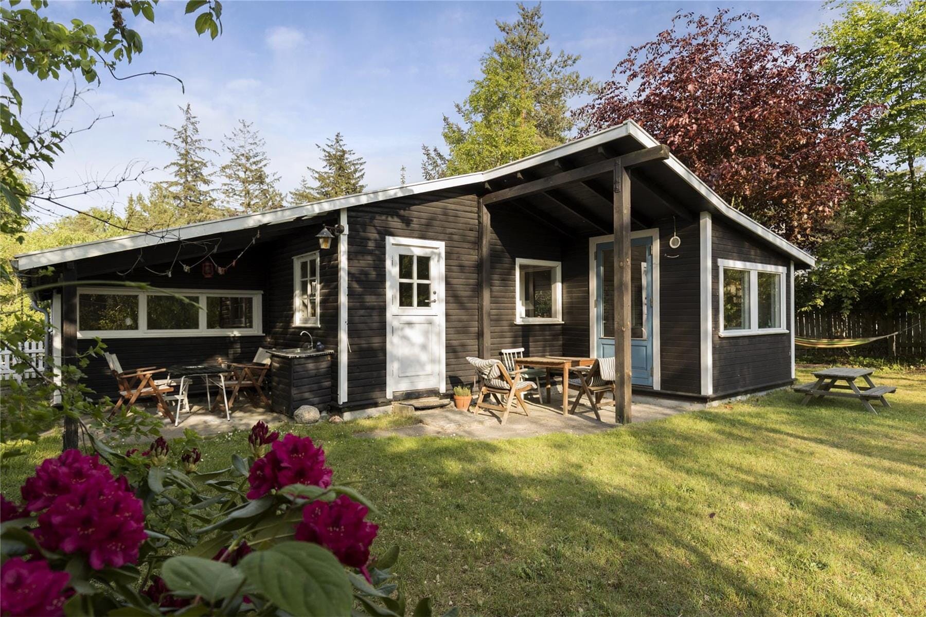 Under open sheds you find two places to sit down to eat and have fun with a board game, while you enjoy the sun. In the dense vegetation in the garden there is a garden trampoline and a bonfire setting, where you simply must try to make twistbread and roast sausages.