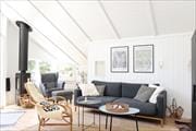 The light and spacious living room with double-height ceiling has windows on all sides, so from the open kitchen you may follow, what is happening indoors as well as outdoors, while you are preparing the coffee. You can have your breakfast by the dining table and later in the day play some board games here. In the soft sofa or the neighbouring bed recess you may relax with a good book. If you have taken a long walk along the beach, it is nice to have a sauna and a spa bath.