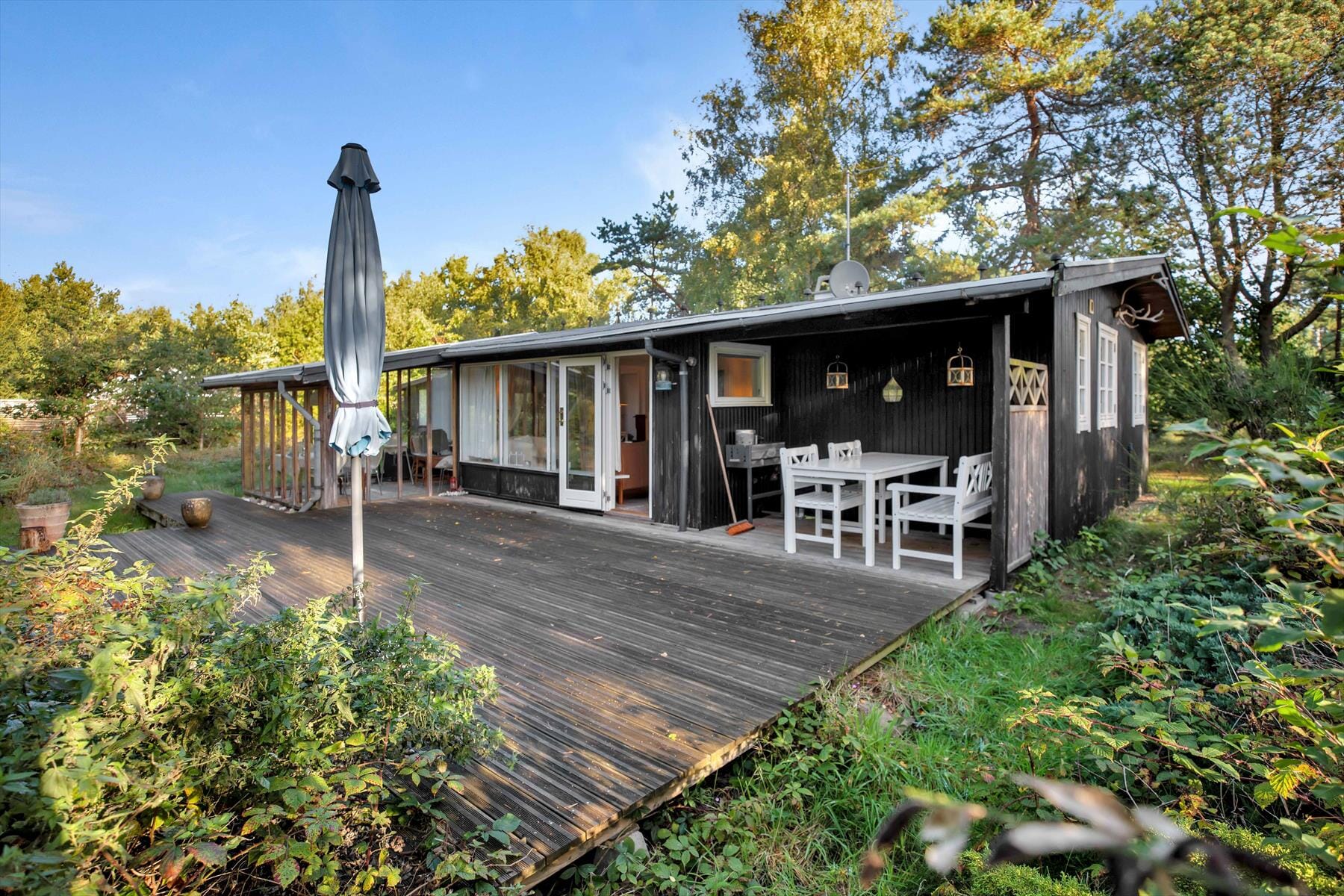 The terrace of the house is south-facing and invites to many good days in the deckchair. On the covered terrace you find a table/bench setting, where you may enjoy lunch or dinner from the barbecue. The plot is a nature plot with nice border vegetation, so you are quite undisturbed. If the wind comes from west, you are sure to hear the roaring of the waves, because only three minutes’ walk from the house you have the lovely and child-friendly sandy bathing beach that you must visit several times a day.
