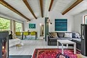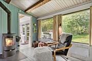 Inside you will find a cozy and functional interior and 4 beds. Here you can enjoy your holiday and relax. In the living room, you can read a book or watch TV or simply listen to the crackle of the wood-burning stove, while enjoying a cup of coffee and a view of the garden. The summer house's open, bright kitchen has direct access to a wooden terrace, where you can enjoy the day's meals together. In the bright garden room you can sit and enjoy a quiet moment and feel a breeze from the open garden door.
