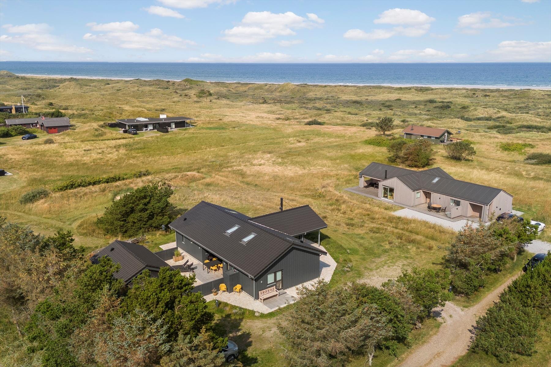 The outdoor spaces around the holiday home are designed for relaxing days under the open sky. There are terraces on both sides of the house, so you can follow the sun or find shade, depending on your mood and the weather. The enclosed courtyard creates a private, sheltered oasis where you can enjoy a refreshing outdoor shower after a trip to the beach or a bike ride in the nearby dune landscape. The open surroundings give a wonderful sense of freedom – and there is a sea view. There are sheltered spots on the property, making it ideal for spending long summer evenings outdoors, perhaps around the barbecue, while the sun sets and the last warm light casts a golden glow across the wooden terrace. The large shed provides plenty of space for bicycles, making it easy to head out and explore the area on two wheels.