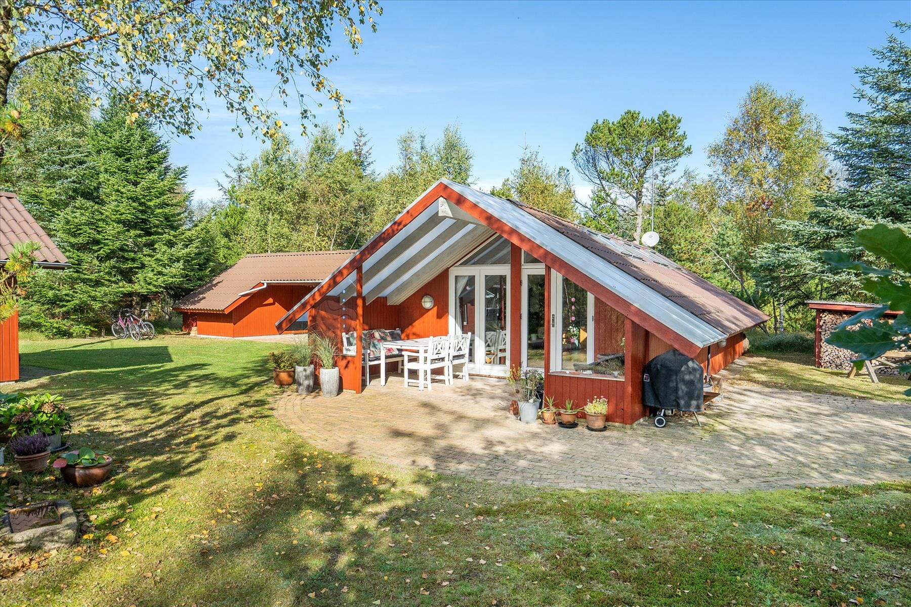 The holiday home is situated on a 2,500 m² plot, where nature takes center stage. Start your day with a cup of coffee on the covered south-facing terrace while enjoying the morning sun and the sound of birdsong in the background. The terrace is the perfect place to spend summer days—whether you want to lounge in a deck chair, enjoy a delicious lunch, or grill a tasty dinner for the family. Children can play freely on the spacious plot while the adults relax in the beautiful surroundings. With so much space available, there are plenty of opportunities for ball games, outdoor activities, or simply a quiet moment in nature.