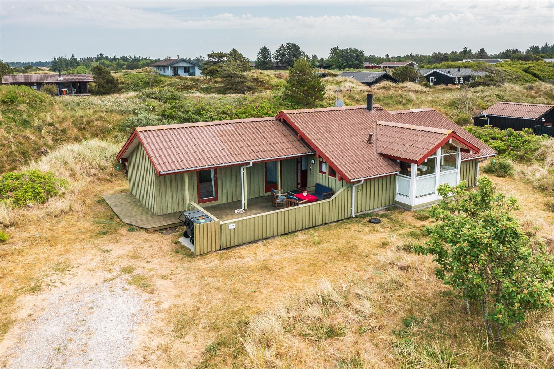 The holiday home’s lovely terraces are ready to tempt you outside as soon as the sun shines. Both terrace areas are partially covered if you prefer some shade, and the wooden fence and rolling natural plot help provide a bit of shelter. If you’d like to sit with a view and be close to nature, you can head up to the viewing bench on top of the dune, where you’ll also find a swing set for the children.