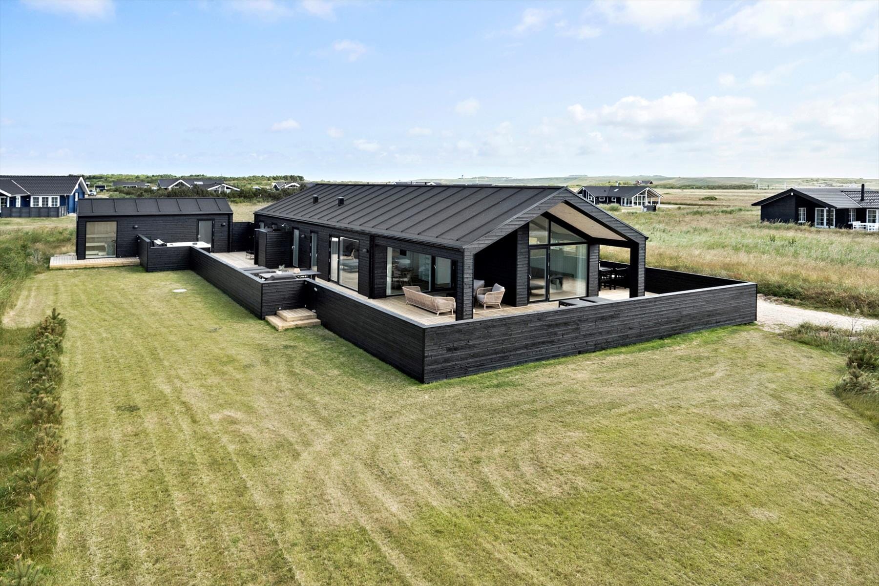 Outdoor life will be a pure pleasure at this holiday home, where both humans and pets have a haven to relax in peace and take in the views. The terrace is furnished with comfortable seating and shelter from the west wind, allowing you to unwind in the sun or enjoy a meal in the open air. The sauna, located in its own annex, is built with a beautiful panoramic window facing nature—perfect for relaxing with an impressive view, any time of year. The outdoor hot tub also offers wellness experiences under the open sky, helping you make the most of your holiday. After a day at the beach or a long walk along the coast, you can rinse off under the warm water of the covered outdoor shower.