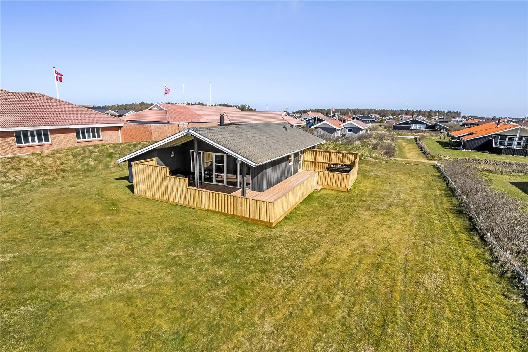 The enclosed terrace surrounding the holiday home is tailor-made for outdoor living – here, you can lean back in a sun lounger with a book in hand, enjoy the sunshine sheltered from the wind, or set the table for a cosy outdoor meal. Because the terrace is enclosed, both children and dogs can stay safely and freely in the green surroundings while you enjoy the peace and the view of the quiet grounds. Around the house, there is plenty of space to play or relax, and the calm atmosphere of the area makes it easy to fully unwind – perhaps with a cup of coffee in the morning sun or a chilled drink at dusk. Here, you can really get close to nature without having to give up comfort.