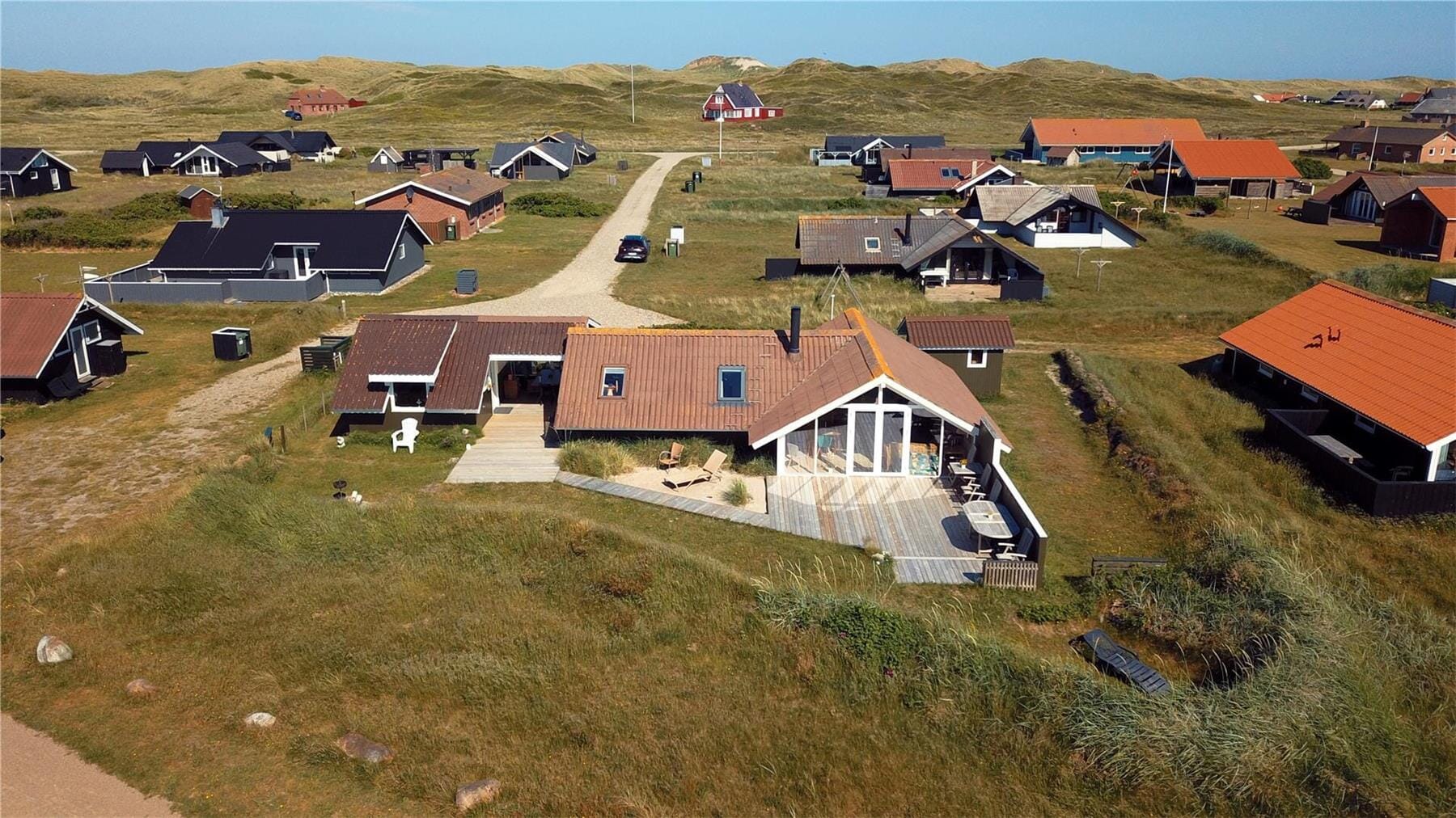 On sunny days, it’s tempting to head out into the garden, where nature unfolds right outside your door. From the terrace, you can settle into the garden furniture with a cup of coffee and enjoy the view of Ferring Lake, sparkling in the sun and inviting you to relax by its calm surface. The house is surrounded by several terrace areas, so you can always find a sunny spot – or a shaded one, if you prefer. It’s easy to slip into holiday mode here, whether you’d rather read a good book, play cards with the kids, or simply sit in silence and listen to the birds and the wind in the dunes. The peaceful holiday home area provides the perfect setting for relaxation, and even when the weather isn’t ideal, you can find shelter and still feel close to nature.