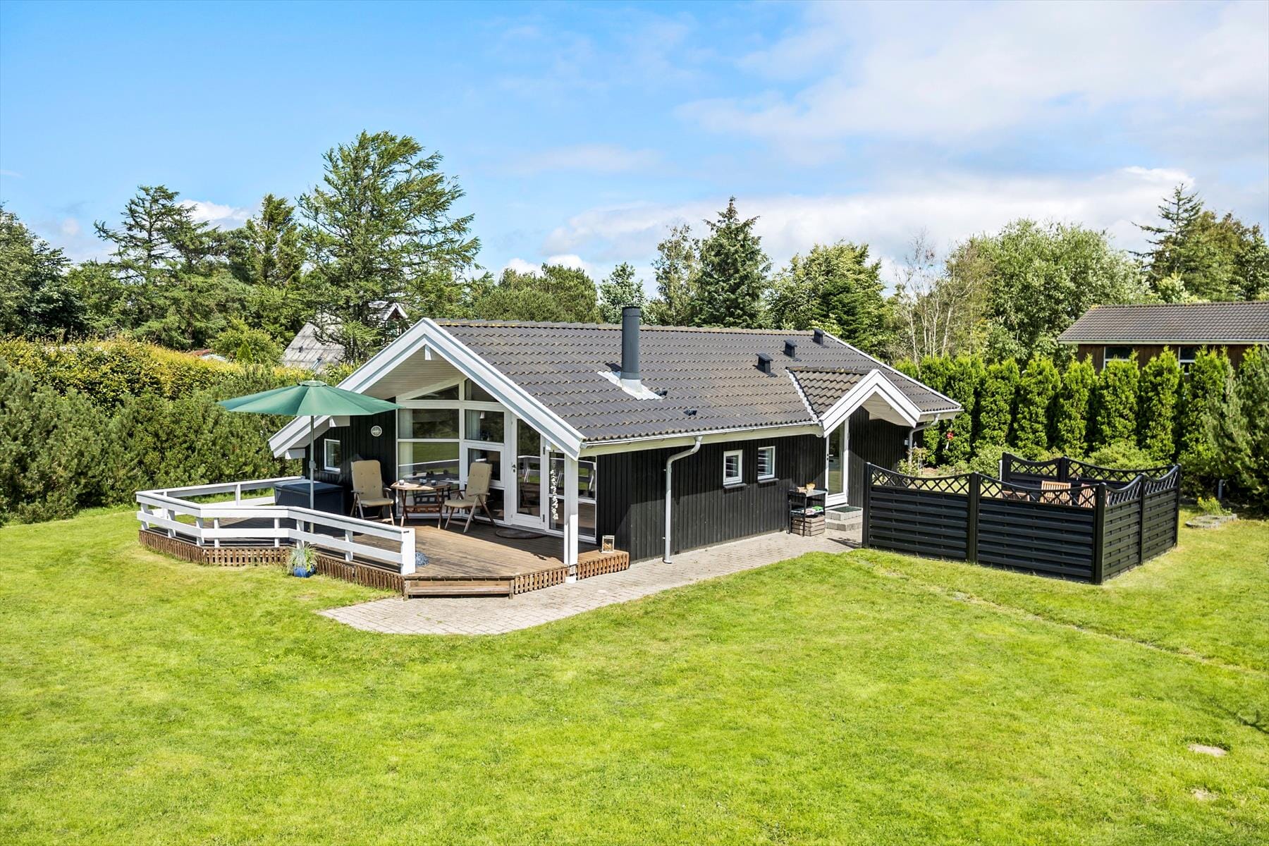 The 1,159 m² plot provides plenty of space for both play and relaxation. The lawn is ideal for a game of frisbee or a water fight on a hot summer’s day, and in the evening, you can look forward to enjoying grilled meals and cool refreshments on the house’s lovely terraces. You also have the option of gathering around the fire pit for cosy evenings as darkness falls.